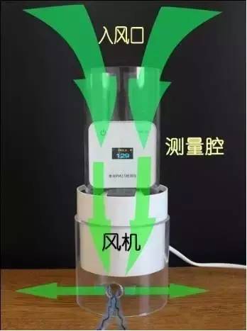 通電后,風(fēng)機(jī)轉(zhuǎn)動(dòng)時(shí)帶動(dòng)氣體向下流動(dòng),將口罩套在入風(fēng)口,在風(fēng)機(jī)的作用下,氣體透過(guò)口罩從入風(fēng)口進(jìn)入測(cè)量腔中,分別測(cè)量通電前PM2.5濃度和口罩過(guò)濾后的PM2.5濃度。